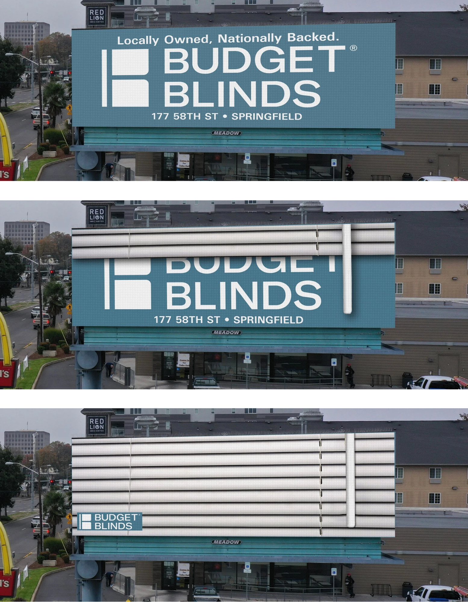 Our own Andrew Husband came home with the ‘Radical Reveal’ prize for his design for the Budget Blinds window coverings store in Springfield, Oregon. His artwork is displayed on a digital billboard in the local area, rotating from the regular ad to gradually closing the blinds with each playthrough.