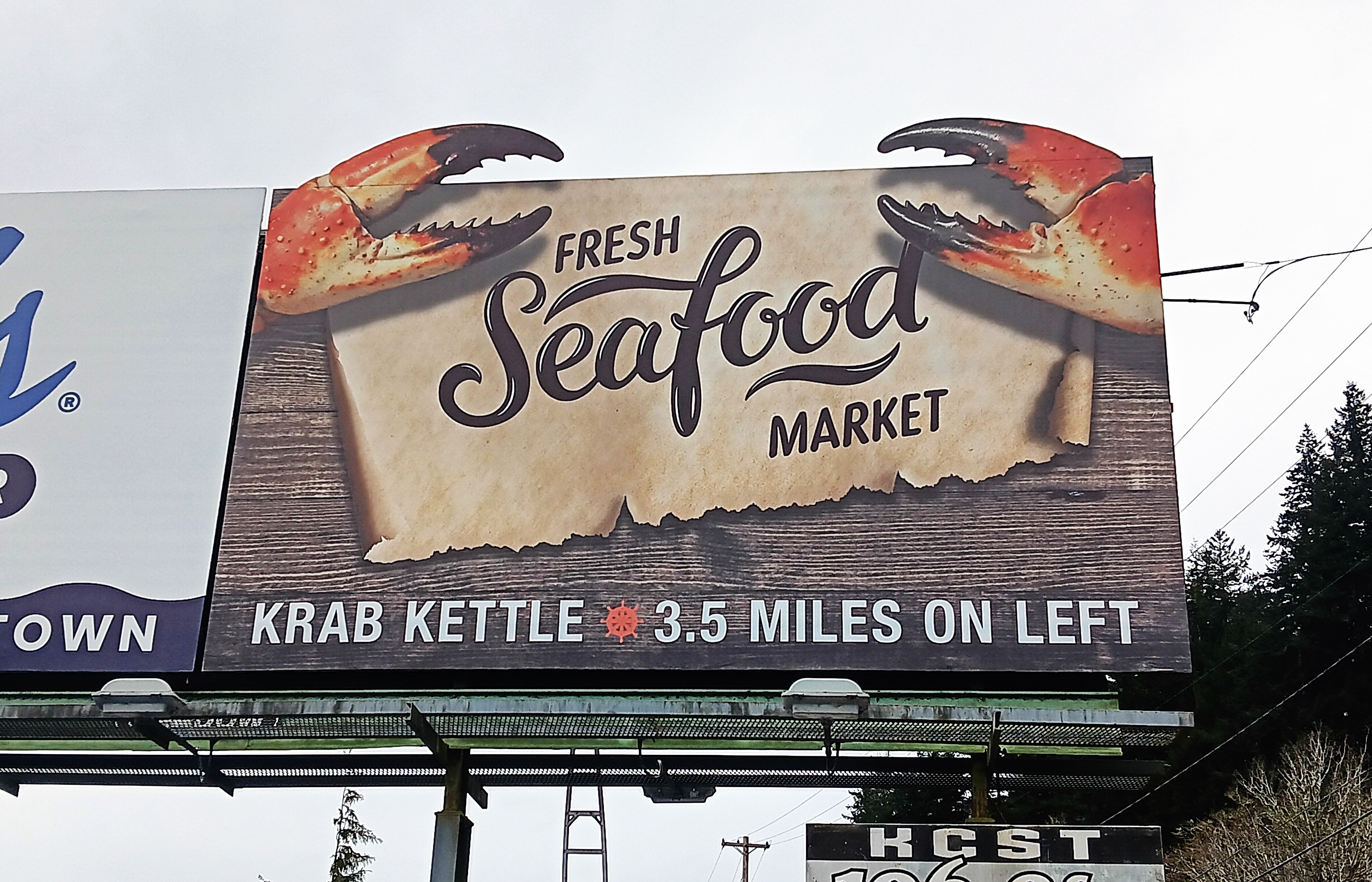 2. Krab Kettle: This display is completely saturated in the business’s coastal brand identity. The crab claws, the woodgrain background, the weathered map, and the tiny ship’s wheel all scream seafood market. The bright orange claws pop against the rest of the elements, and as extensions, they all pop against the gray coastal sky.
