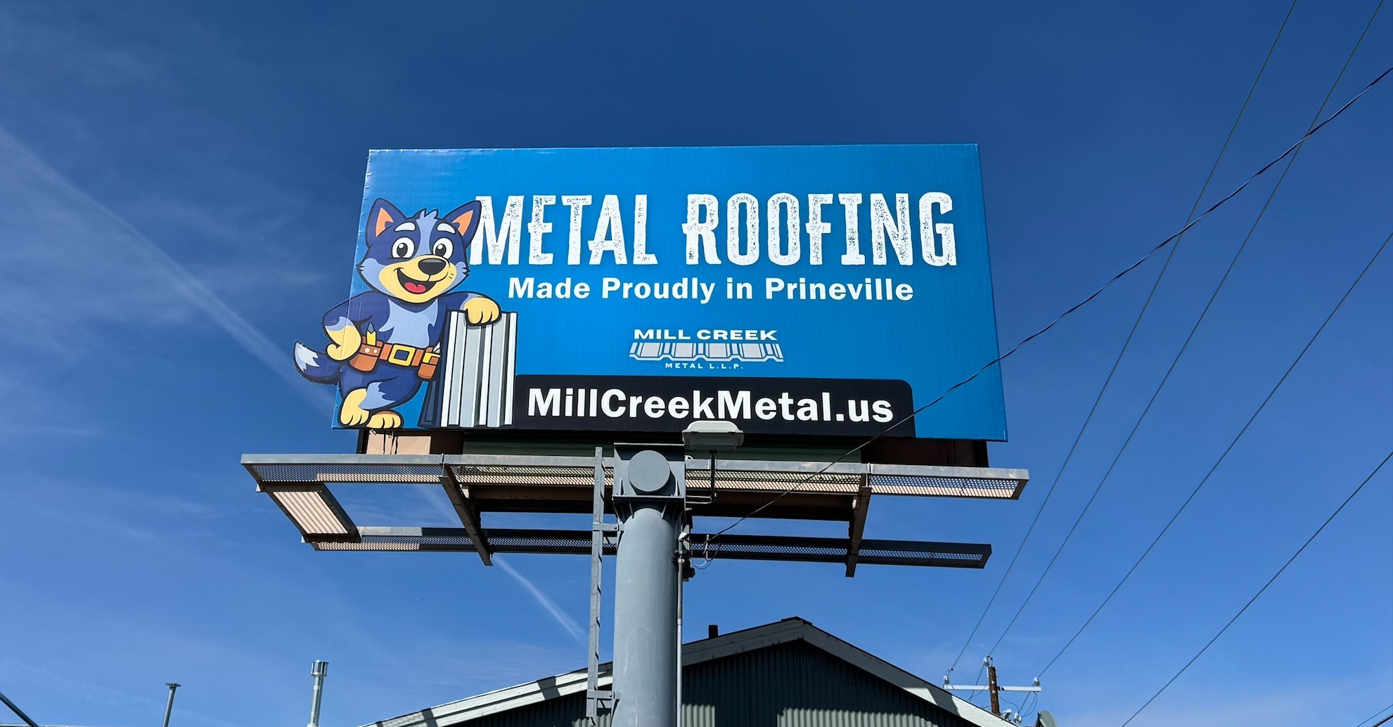 8. Mill Creek Metal: This display catches your attention with a cute business mascot as a side extension and communicates to the viewer the brand identity quickly with a rough, jagged font.