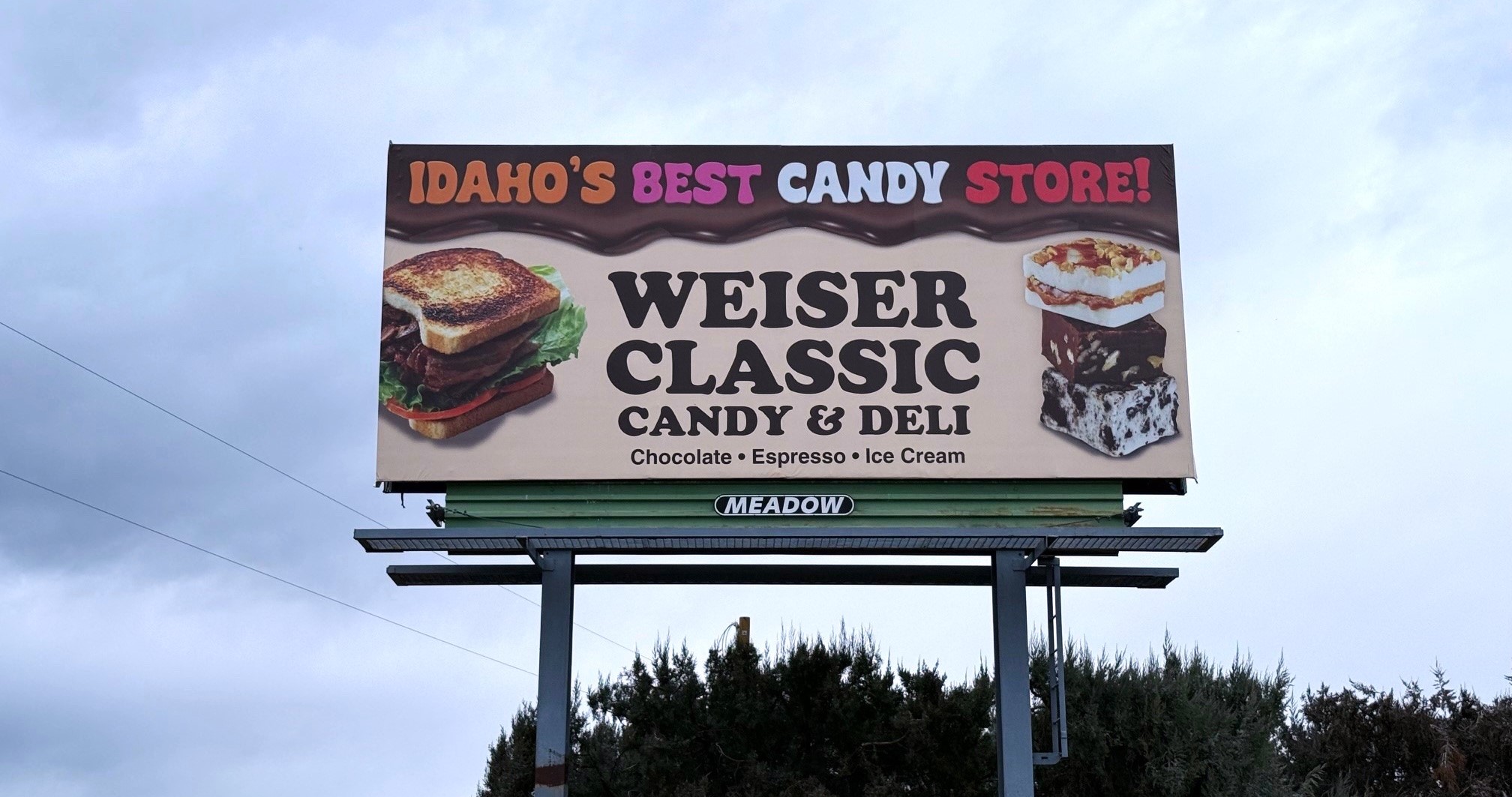 10. This design immediately communicates the draw for the business, candy! It relies on viewers Googling the name of the store rather than listing a contact method, which is a more effective choice. It also utilizes bright colors, which make it really pop against the natural scenery.